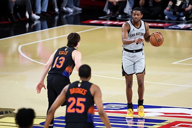 本场比赛中,马刺的先发控卫达隆-福克斯(De'Aaron Fox)显然并没有发挥出自己的实力。福克斯全场出场31分40秒,投篮13中5,三分线外6中2,罚球6中4,得到了16分2篮板9助攻1抢断的数据,还有5次失误和3次犯规,正负值为-4。福克斯在本场比赛中完全没有展现出自己的得分能力,他的进攻效率并不理想,他的突破成功率非常有限,外线投篮方面的表现也并不是特别理想。福克斯展现出了一定的传球能力和组织能力,然而他在失误控制方面也存在着不小的问题。不仅如此,福克斯在防守端的表现也是比较一般的,贡献度同样是非常有限的。福克斯本应该是球队的后场核心,然而至少在本场比赛中,他并没有很好地扮演自己的角色,并没有将自己在进攻端的全能性发挥出来,这也在一定程度上导致了球队的这场失利。